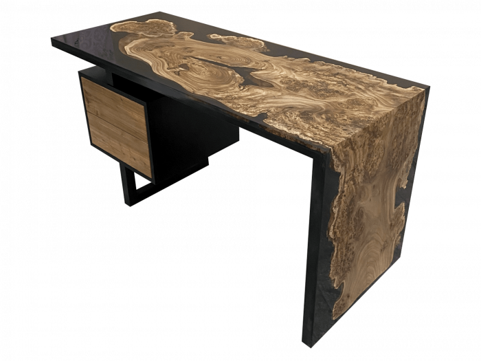 Стол из слэба карагача в обрамлении черной эпоксидной смолой в минималистическом стиле будет настоящей изюминкой вашего кабинета. С двумя ящиками, система открывания Tip-on. Высота стола 75 см. Толщина столешницы 40 мм.