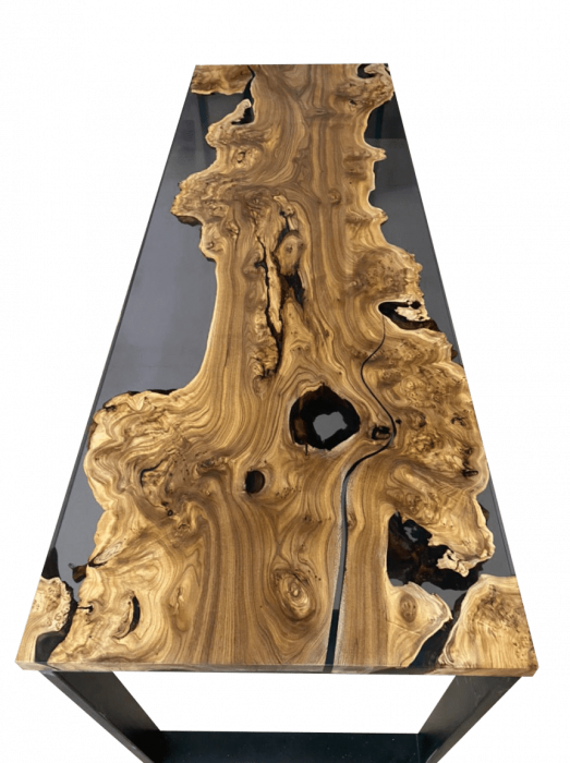 Настоящая жемчужина наших работ, эксклюзивный обеденный стол из массива горного вяза в сочетании с эпоксидной смолой. За основу была взята эксклюзивная заготовка карагача. По краям столешницы идут оригинальные заливки эпоксидной смолой светло-черного оттенка, все природные неровности, сучки, трещины так же пролиты смолой. Поверхность столешницы прошла несколько стадий ручной шлифовки и полировки, при тактильных прикосновениях вы будете испытывать только самые позитивные эмоции. Основание выполнено из профиля 90х30 и окрашено порошковым покрытием. Возможно изготовление под заказ.